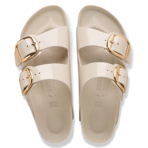 Introducing the BIRKENSTOCK Arizona Big Buckle sandal, a timeless icon elevated with bold, elegant hardware. Designed with a semi-exquisite cork-latex footbed fully lined in soft piumato leather, this style delivers premium comfort and refined detail. The glossy natural patent leather upper adds a sophisticated finish, making it perfect for both everyday wear and dressier occasions.