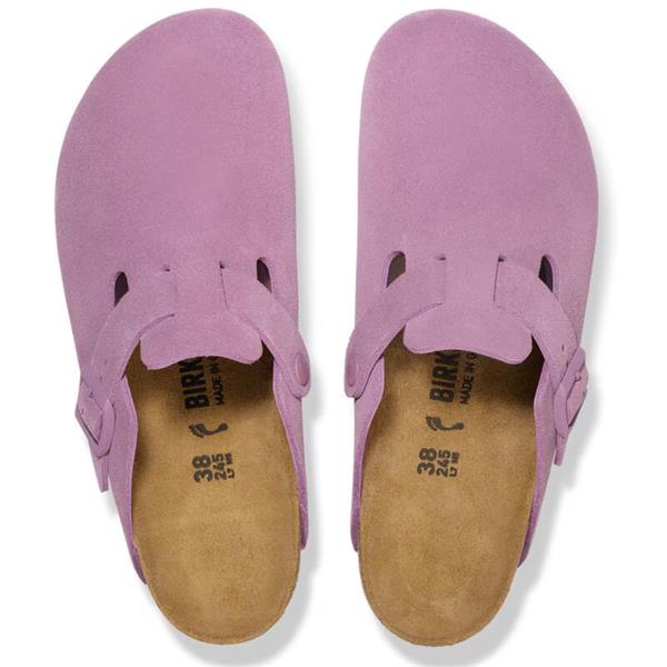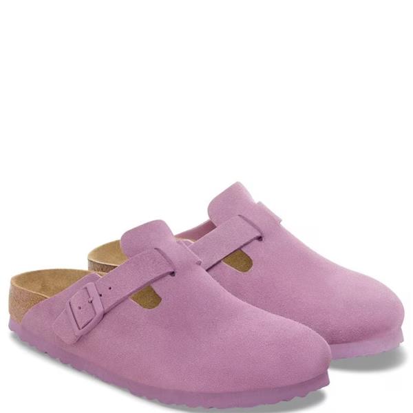 The iconic Birkenstock Boston clog in soft mauve suede, featuring a single adjustable metal buckle strap. Designed with a contoured cork footbed and natural leather insole, it offers lasting comfort and support. The lightweight EVA outsole provides flexibility and cushioning for everyday wear.