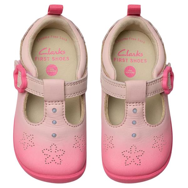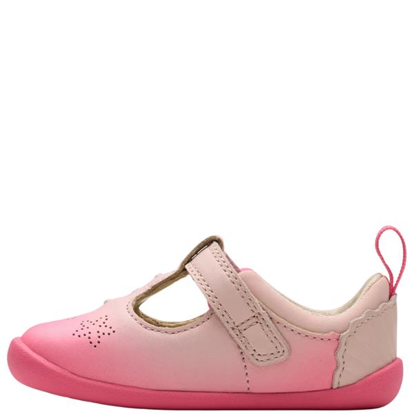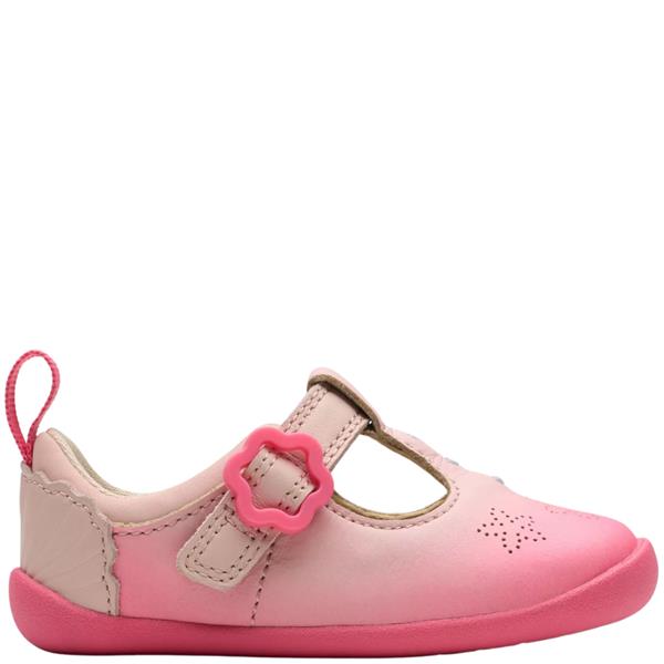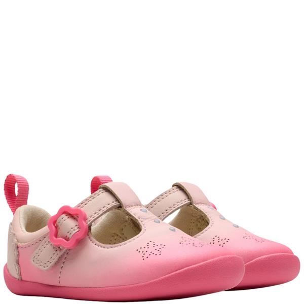 Designed for toddlers taking their first steps, the Clarks Roamer Shell blends adorable design with practical comfort. Made in ombré-effect pink leather, this T-bar shoe features a star-shaped buckle for easy fastening, a foam footbed for soft cushioning, and a flexible rubber sole to support natural movement and protect little toes.