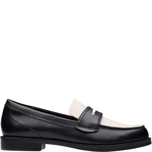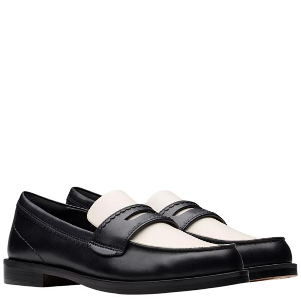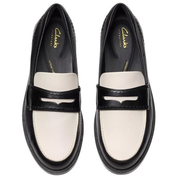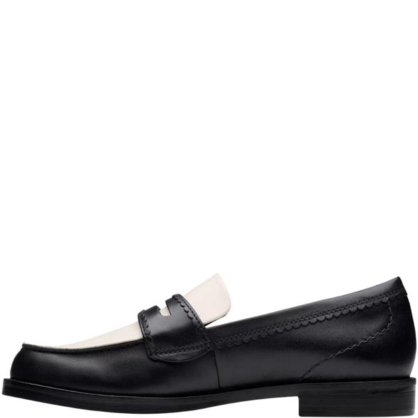 Clarks women’s Straven Edge loafer in black multi leather, crafted for effortless everyday and office wear. Featuring a scalloped-trimmed upper with wheeling rand detail for a refined, crafted aesthetic. The moulded Contour Cushion footbed provides superior underfoot support, while the lightweight, flexible rubber outsole ensures comfort from morning to evening.