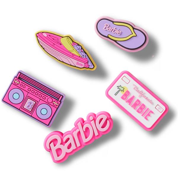 Add a playful retro twist to your Crocs with this exclusive 5-pack of Barbie™ Jibbitz™ charms. Featuring fun throwback icons like a jet ski, flip flop, California license plate, boombox and the Barbie logo, this set is perfect for customising clogs, sandals or accessories with bold personality. Please note: these charms are not a toy and are not intended for children under 3 years of age.