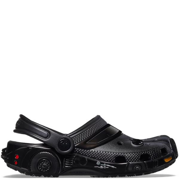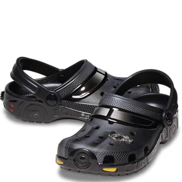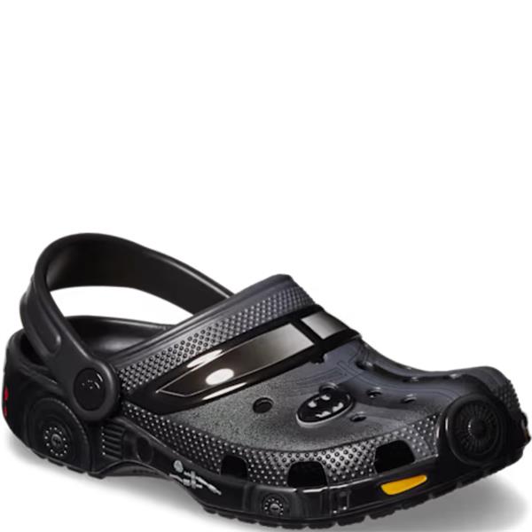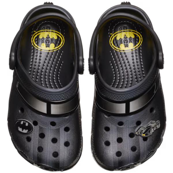 Crocs Batman Classic Clog for kids in black, inspired by the legendary Batmobile. This exclusive edition features bat-wing details on the heel strap and fixed Batman Jibbitz™ charms for a heroic look. Crafted from lightweight, water-friendly Croslite™ material with ventilation ports for breathability and easy cleaning. Pivoting heel straps ensure a secure fit, while the Iconic Crocs Comfort™ design provides 360° lightweight cushioning for all-day play.
