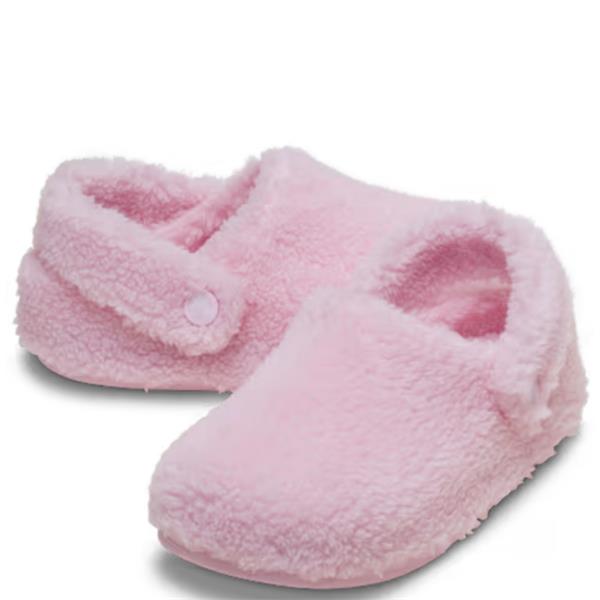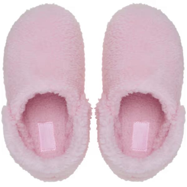 Crocs Classic Cozzzy Slipper for kids in soft pink, perfect for cosy days indoors. Featuring 360° faux-shearling lining for warmth, a sink-in cushioned footbed for plush comfort, and a textured outsole for better grip during play. The cozy backstrap ensures a secure fit, making it ideal for relaxing or lounging at home.