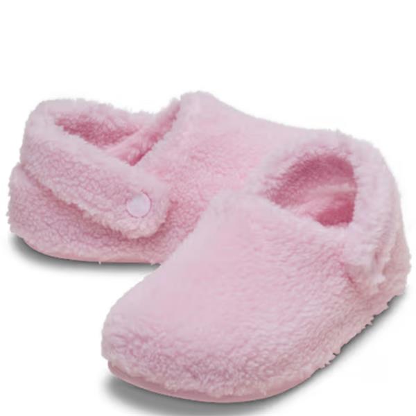 Crocs Classic Cozzzy Slipper for kids in soft pink, designed for cozy indoor comfort. Featuring a full faux-shearling lining for warmth, a sink-in cushioned footbed, and a grippy textured outsole that ensures stability during play. The elastic backstrap provides a secure fit, making it perfect for relaxing days indoors.