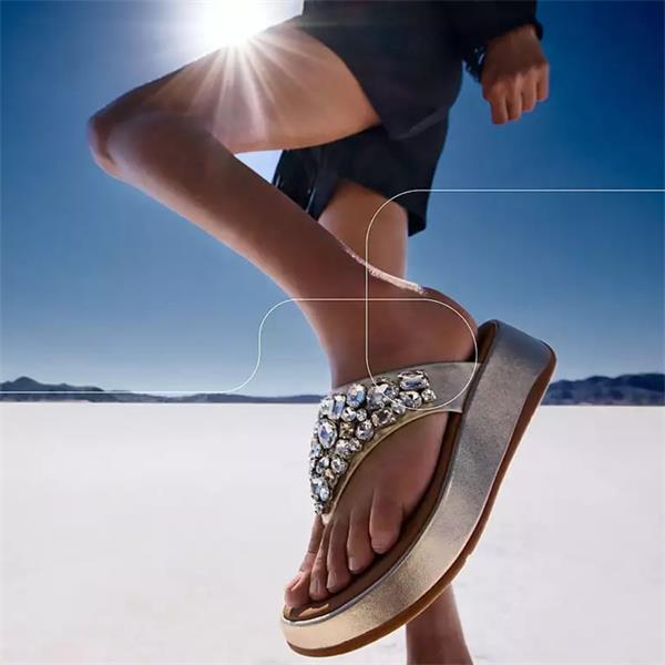 Back by popular demand, the Platino Wedge Sandal dazzles with sparkling crystal embellishments and sleek metallic leather. Set on FitFlop’s iconic Microwobbleboard™ midsole, it provides cushioned support with a touch of elevation—perfect for adding glamour to both day and night outfits. APMA-approved for promoting good foot health.