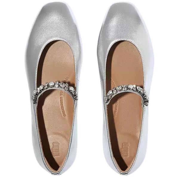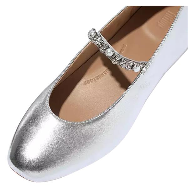 A refined ballerina designed to combine elegant styling with all-day comfort. Crafted in shimmering silver leather with pearl and crystal embellishments, it features FitFlop’s Dynamicush™ cushioning for supportive, lightweight wear.