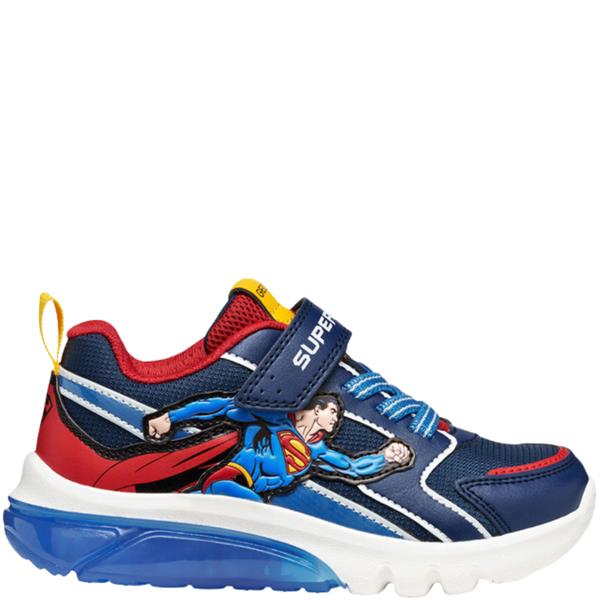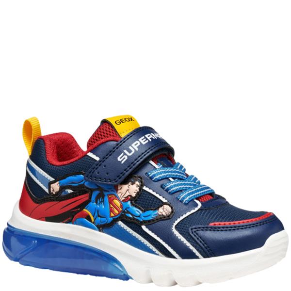 A boys’ trainer from Geox inspired by the iconic Superman character, created in collaboration with Warner Bros. Crafted in a blue and red colourway with leather-effect synthetic and textile materials, it features light-up soles for a fun and sporty look.