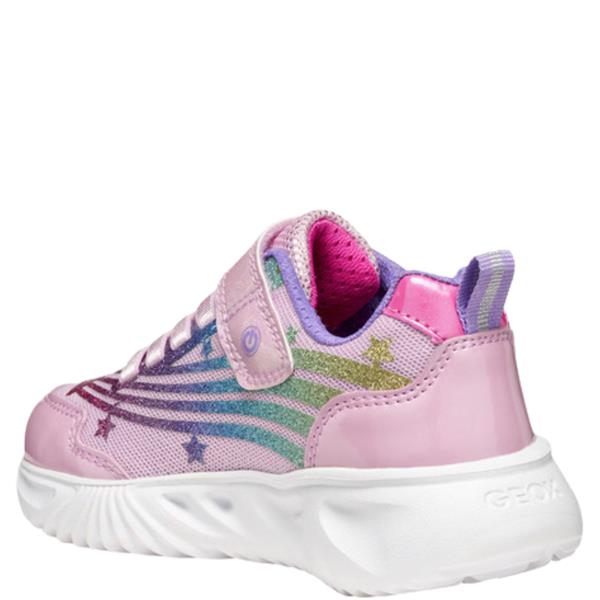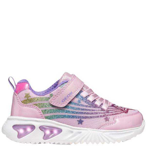 The Geox Assister trainer brings bold colour, sparkle and energy to everyday wear. Designed in pink with shiny fabric, pearlescent leather-effect panels and patent details, it features multi-coloured accents that add playful style. Built-in lights in the sole provide extra fun, complete with an on/off switch for convenience. Lightweight and cushioned, it supports active play, while the elasticated laces and single riptape strap ensure quick, secure fastening.