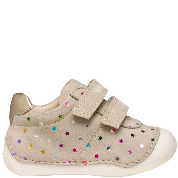 The Geox Tutim first-steps shoe is designed to protect and support babies as they begin to crawl and take their first movements. Crafted from printed suede and pearlescent leather-effect material in soft beige and light gold, it offers a romantic look with exceptional flexibility. The reinforced toe and heel provide stability, while the flexible Flexy System tread supports natural movement. A quick riptape fastening ensures easy entry, and the chrome-free leather insole keeps little feet safe and comfortable.