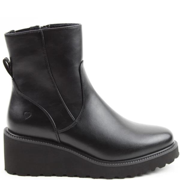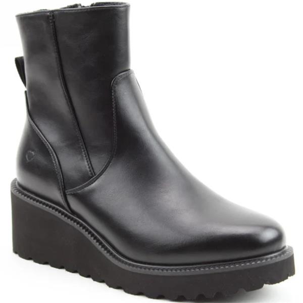 Heavenly Feet women’s SILVIA wedge zip boot in black, part of the Litesoles collection that combines comfort, colour, and modern style with a super lightweight feel. Crafted from smooth synthetic materials, this vegan-friendly boot features a convenient side zip for easy on/off and a wedge heel that offers a flattering lift without sacrificing stability. The removable memory-foam insole ensures exceptional comfort for all-day wear.