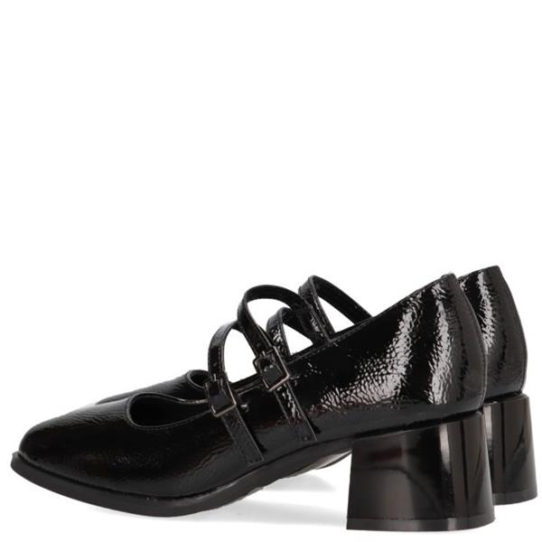 A refined court-style shoe designed for versatility and comfort. This Hispaflex women’s shoe features a sleek black patent synthetic upper with a classic strap and buckle fastening for a secure fit. Set on a medium heel, it offers balanced elevation suitable for both daily wear and special occasions, from office looks to evening events.