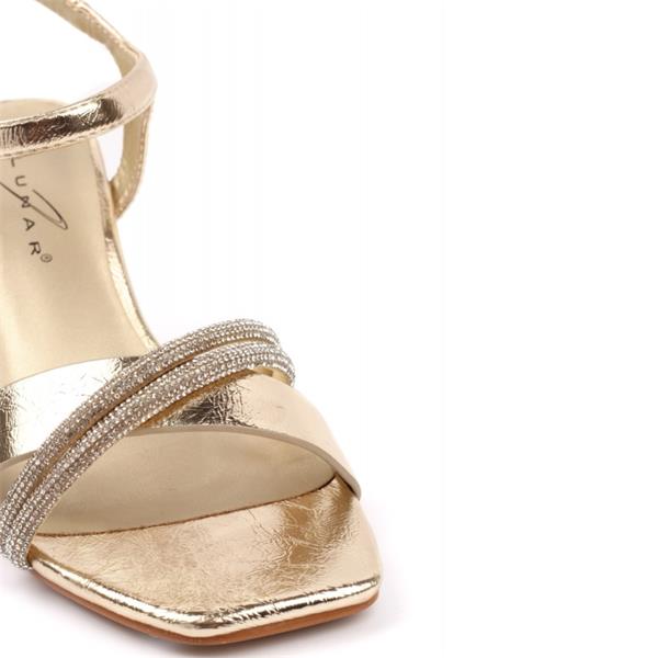Add a glamorous finish to your occasion wardrobe with this Lunar mid heel sandal in shimmering Gold. Featuring metallic straps, sparkling rhinestone details and a comfortable block heel, it is perfect for weddings, parties and summer evenings.