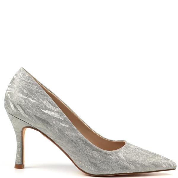 The Lunar Jada court shoe brings refined elegance to any occasion with its eye-catching silver swirl design. Featuring a sleek pointed toe and cushioned insole, it offers both style and comfort for special events.