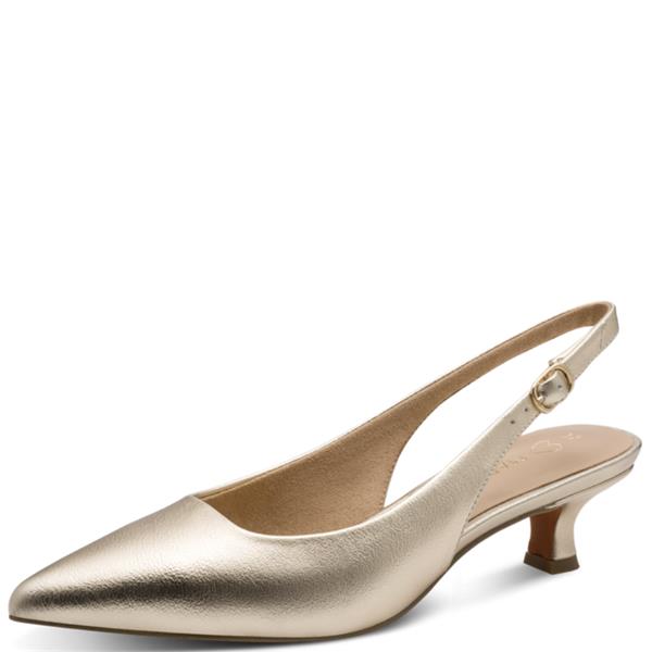 Classic elegance meets modern comfort with the Marco Tozzi Women's Low Heel Sling Back in gold. Featuring SOFT LINING technology for a cushioned feel, the FEEL ME soft footbed ensures all-day comfort, while the 100% vegan construction offers a cruelty-free choice. With a 40mm low heel, this slingback provides subtle lift and style, making it perfect for both casual and formal occasions.