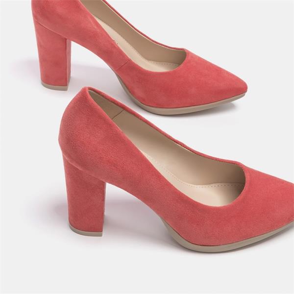 Pink Deserts beautiful coral suede heels feature a pointed toe with a block heel of 9cm and width of 3cm. These chic heels are finshed with a non-slip rubber sole, and are lined inside with a padded sole to give maximum comfort and freshness to the foot.