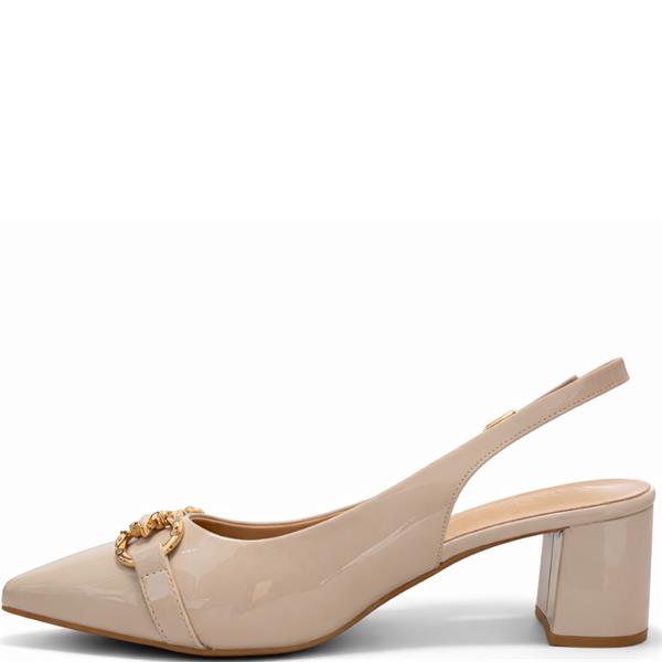 A sleek and elegant mid heel designed for versatile occasion wear. Finished in glossy beige patent, this Redz slingback offers a timeless look with a comfortable mid-height heel—perfect for events, work or smart-casual styling.
