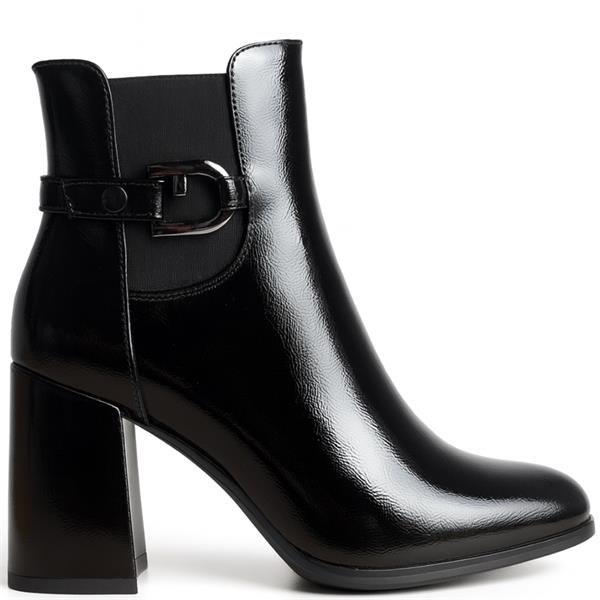 Redz women’s D6401 ankle boot in glossy black patent finish, combining a sleek modern look with everyday comfort. Featuring a convenient side zip for easy on/off and an approx. 6 cm heel that provides an elegant lift while ensuring stability. Perfect for dressing up casual outfits or completing a polished evening look.