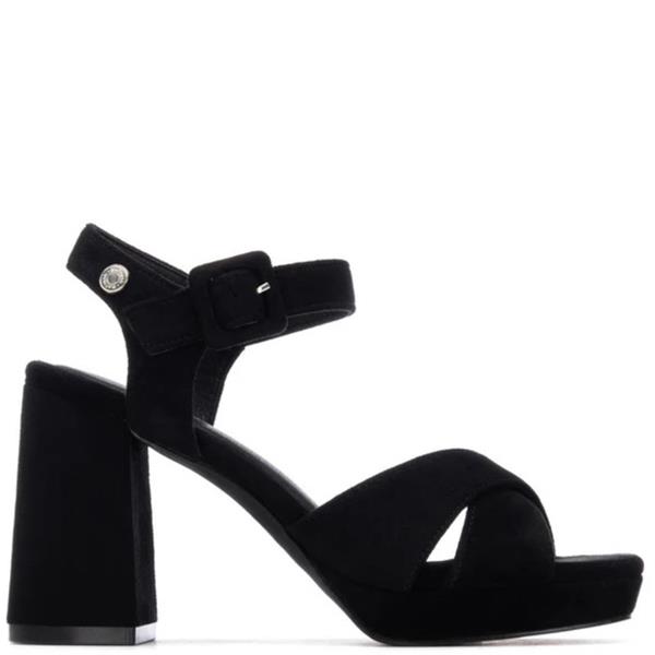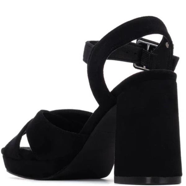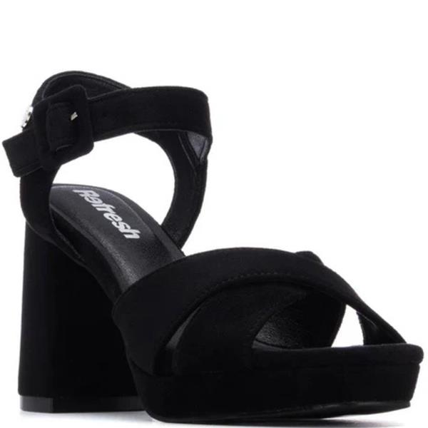 An elegant and sophisticated high heel sandal designed for special occasions and statement looks. Finished in black suede-look material, this Refresh style features a front platform for added comfort and stability while maintaining a striking silhouette.