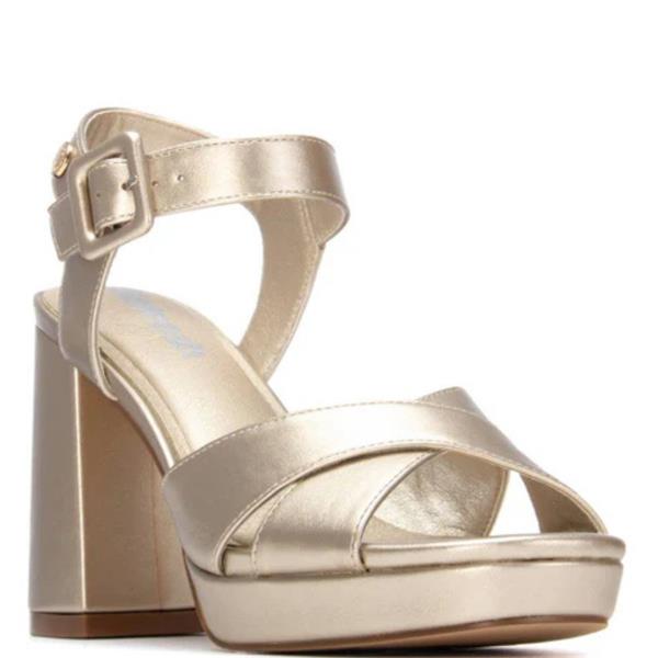 An elegant and sophisticated high heel sandal designed for special occasions and statement looks. Finished in gold suede-look material, this Refresh style features a front platform for added comfort and stability while maintaining a striking silhouette.