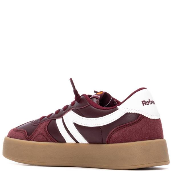 A stylish gumsole trainer from Refresh, crafted in burgundy leather-effect material. Designed with adjustable laces, a chunky non-slip rubber sole, and a removable insole for added comfort. Certified vegan by PETA.