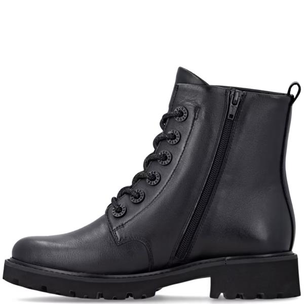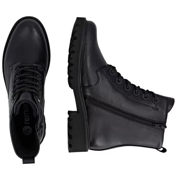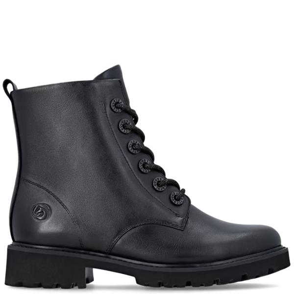 Remonte women’s ankle boot in black leather, designed with both lace-up and side zip fastening for a secure fit. Featuring a cushioned removable insole, glued construction, and a comfortable 3.9 cm heel, this lightweight style is built for everyday wear.