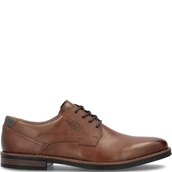 Rieker men’s lace-up shoe in brown leather, crafted with textile and synthetic lining for comfort. Designed with glued construction for durability and set on a 2.5 cm heel, this versatile style ensures reliable everyday wear.