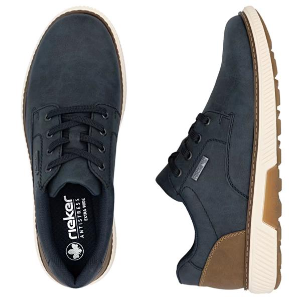A versatile lace-up casual shoe from Rieker, crafted in blue synthetic material with a TEX membrane for water resistance. Features a wide fit, memory foam insole, and a comfortable 3.6 cm heel for everyday wear.