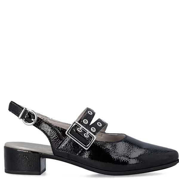A comfortable and versatile low heel sandal designed for everyday wear. Finished in classic black with a secure buckle fastening for a refined look.