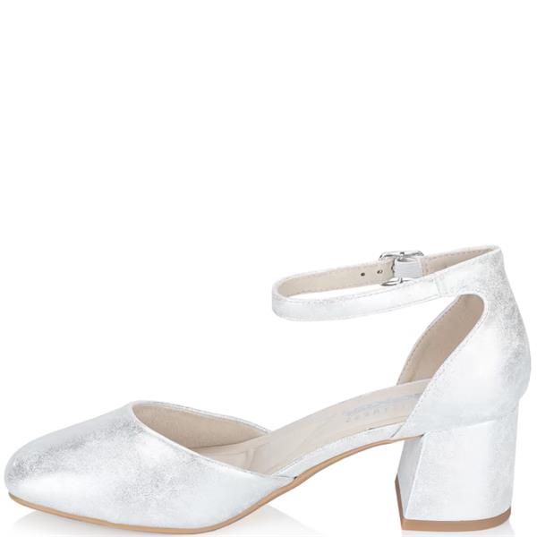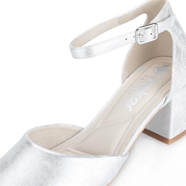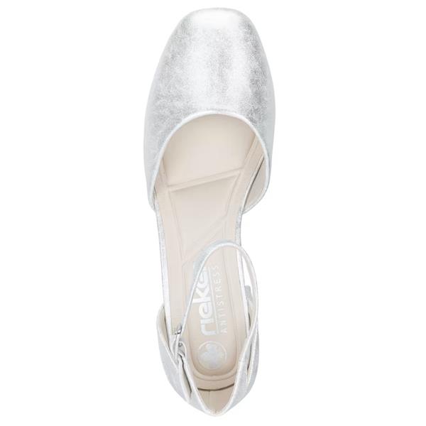 A stylish and elegant mid heel sandal designed for versatile summer wear. Finished in a silver platinum tone with subtle metallic accents, this Rieker style combines a feminine look with everyday comfort.
