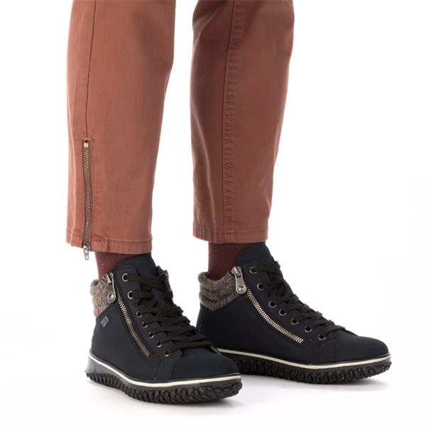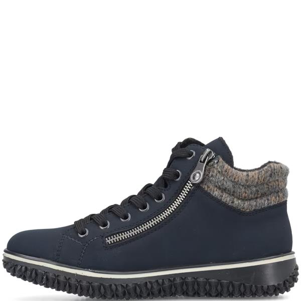Step out in style with these blue Rieker lace-up boots for women, combining fashion and function. Crafted with both lacing and a side zipper, these boots offer a secure fit and easy wear. The chic felt-look shaft collar adds a stylish touch, while the grippy sole ensures stability on any surface. Featuring RiekerTEX water-resistant technology, these boots keep your feet dry and comfortable in all weather conditions. Ideal for those searching for waterproof women's boots, comfortable lace-up boots, or stylish winter footwear.