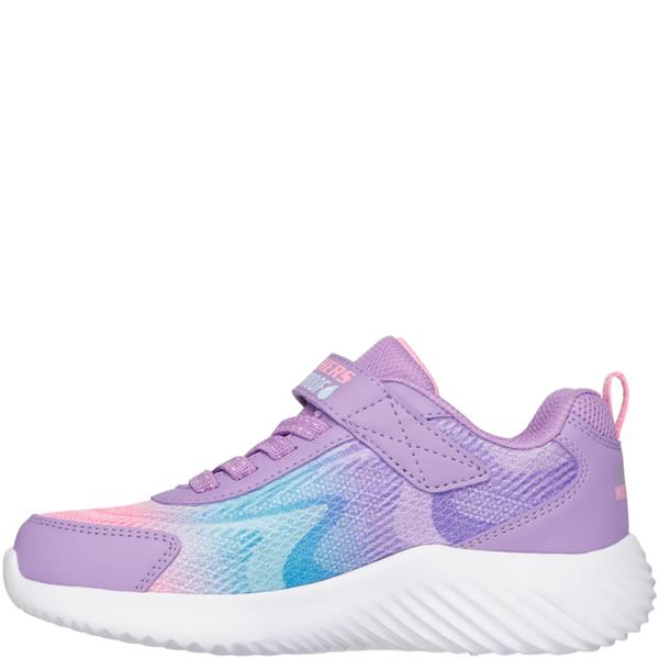 Skechers girls’ 303452L waterproof trainer in lavender multi ombré mesh, combining sparkle and practicality. Designed with a seam-sealed waterproof construction to keep feet dry, it features stretch laces and an adjustable strap for an easy, secure fit. The shock-absorbing midsole and flexible traction outsole ensure comfort and stability, while the lightweight design keeps every step soft and supported.