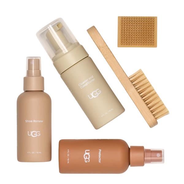 A complete care set containing everything needed to clean, protect, and refresh UGG sheepskin boots and slippers. Includes a cleaner & conditioner, protector, shoe renew, a bamboo handle brush, and a suede scuff eraser.
