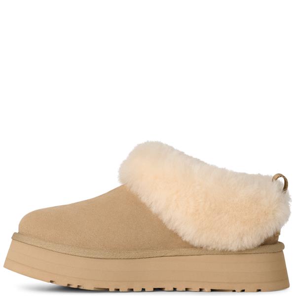 The UGG Tazzelle slipper blends elevated comfort with signature UGG style. Crafted from soft suede with a plush sheepskin collar, it offers warmth and luxury for everyday wear. The 10 mm sheepskin lining and insole provide superior softness, while the Sugarcane EVA outsole and cushioned midsole deliver lightweight support and flexibility. Finished with an embossed suede heel label, this platform slipper combines cosy comfort with modern flair.