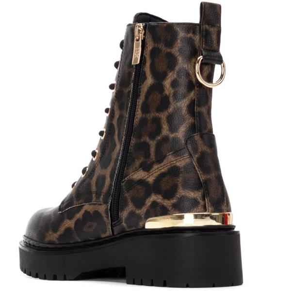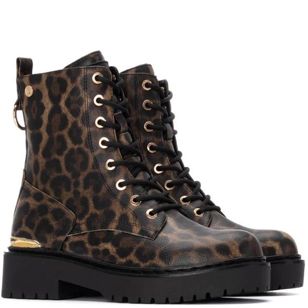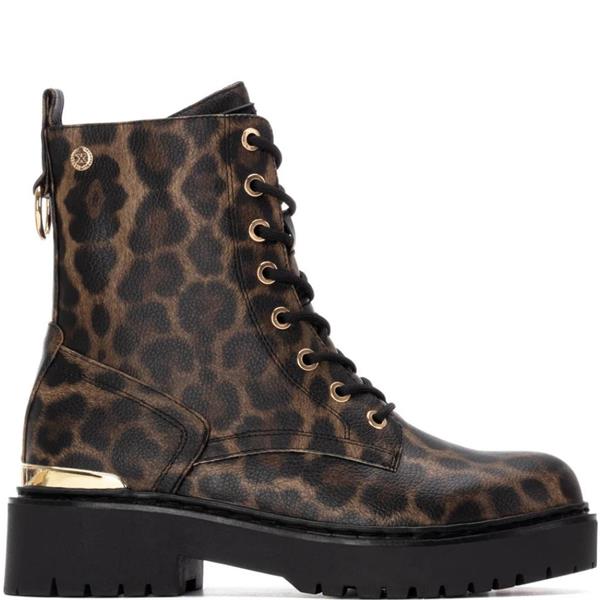 A fashionable lace-up ankle boot from Xti, crafted in leopard-print synthetic with a military-inspired design. Featuring a convenient inner side zip for easy wear, metallic heel detail for added style, and a 5 cm sole for stability and comfort. Certified vegan by PETA.
