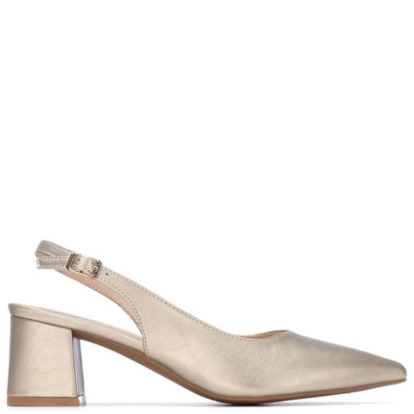 A stylish and versatile slingback shoe designed for effortless day-to-evening wear. Finished in gold with a comfortable low heel for elegant everyday styling.